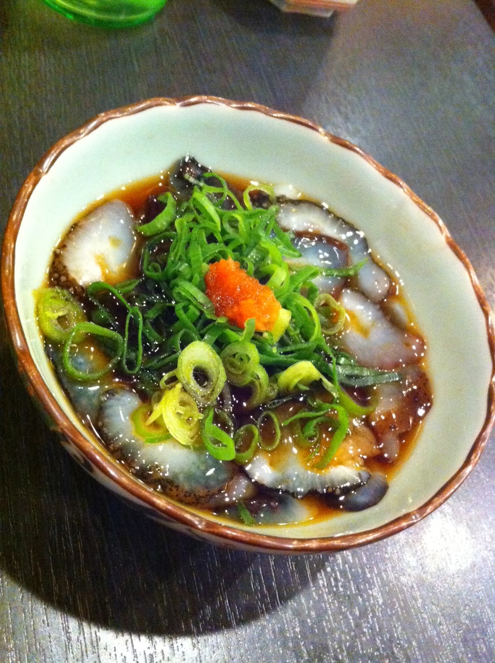 On a pour habitude de sortir une fois par semaine en moyenne. Une bonne occasion pour décompresser. Le choix du restaurant où nous arreter prend souvent longtemps. Surtout parce que je veux toujours essayer des nouveaux trucs. (avec plus ou moins de flair il faut l’admettre.) La dernière fois nous avons essayé un izakaya près de la gare de Bentencho (comme ça on peut rentrer à pieds.) Un izakaya c’est une sorte de restaurant-bar japonais très populaire. On y trouve des boissons comme dans un bar et toute sorte de petits plats, apéritifs (cornichons…) ou mets plus consistants (pizza…). Les prix sont très variables selon les établissements ainsi que la nourriture. Nous avons commandé :